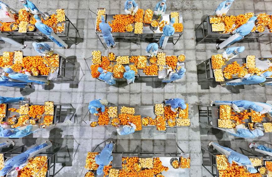 新年伊始,湖北省宜昌市秭归县的脐橙加工企业开足马力,对收获的脐橙进行深加工,制成脐橙酒、橙皮丝、脐橙茶、脐橙果酱等产品,供应市场。